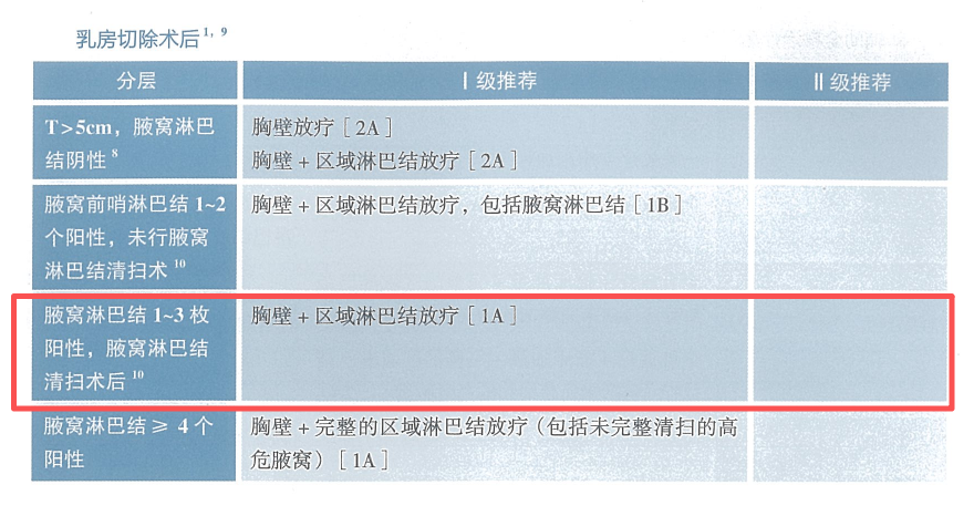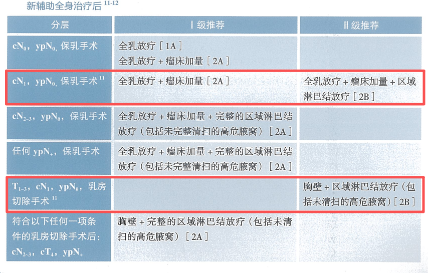 2025版《CSCO BC指南》对于cN1、ypN0、接受保乳手术的患者,放疗推荐与当时的NCCN指南一致,即Ⅰ级推荐为“全乳放疗±瘤床加量+区域淋巴结放疗,未行腋窝清扫者需考虑包括未清扫的高危腋窝[2A]”,Ⅱ级推荐为“全乳放疗±瘤床加量”。2026版《CSCO BC指南》根据NSABP B-51研究的结果进行了调整:Ⅰ级不再推荐区域淋巴结放疗,改为“全乳放疗±瘤床加量[2A]”;Ⅱ级推荐为“全乳放疗+瘤床加量+区域淋巴结放疗[2B]”。对于cN1、ypN0、接受乳房切除手术的患者,Ⅰ级推荐留空,Ⅱ级推荐为“胸壁+区域淋巴结放疗(包括未清扫的腋窝)[2B]”。