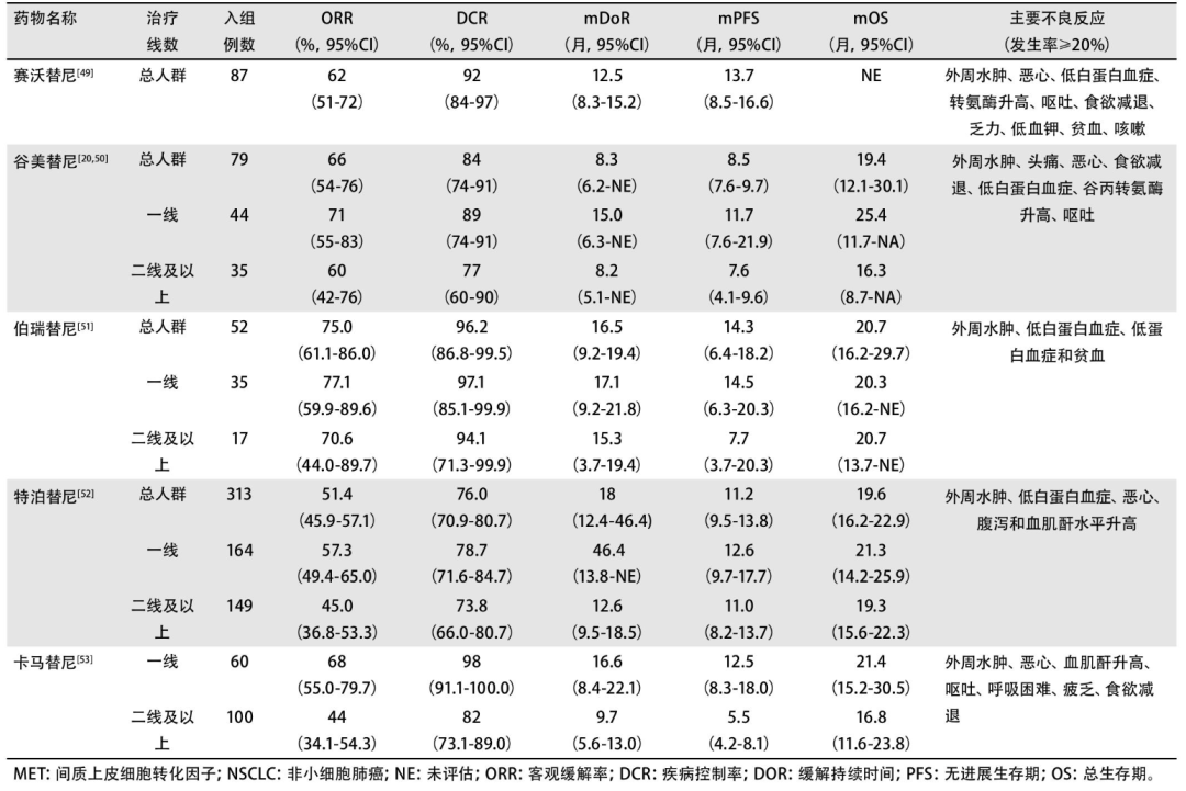 表:治疗MET ex14跳跃突变的靶向药物(口服)在局部晚期或转移性NSCLC中关键临床研究数据[3]