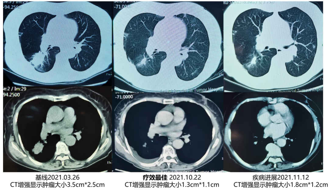 参加临床试验,2021年3月底开始口服特泊替尼,5月底CT示肿瘤大小1.4cm*1.3cm,11月12日为1.8cm*1.2cm,病灶较前变大伴纵隔右肺门稍大淋巴结,疾病进展出组。