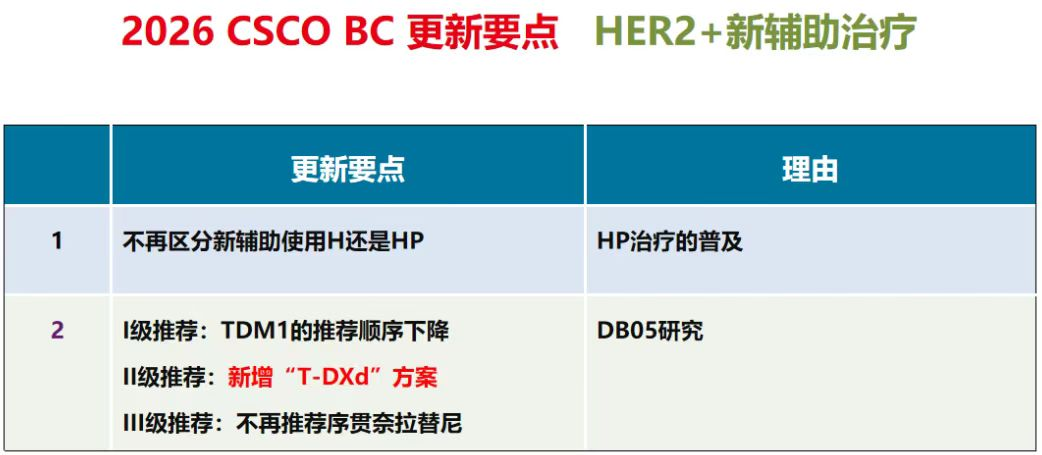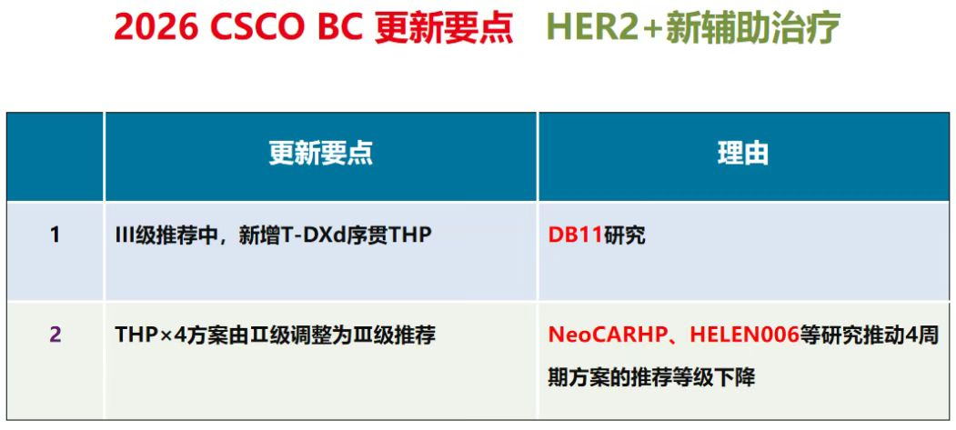 在新辅助治疗方面,一是THP×4方案(紫杉类+曲妥珠单抗+帕妥珠单抗,4周期)由Ⅱ级推荐、1B类证据调整为Ⅲ级推荐、2B类证据;二是基于DESTINY-Breast11(DB11)研究,德曲妥珠单抗(T-DXd)序贯曲妥珠单抗及帕妥珠单抗(THP方案)获得Ⅲ级推荐,同时该方案已于2026年3月在国内获批HER2阳性高危早期乳腺癌新辅助治疗适应症,为高危患者提供了重要的治疗选择。