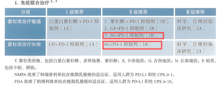 关于免疫联合治疗,2025版指南该章节的小标题为“解救化疗+免疫治疗”,而2026版指南中调整为“免疫联合治疗”。既往该部分内容中,无论是Ⅰ级推荐还是Ⅱ级推荐,均为化疗+免疫治疗。而在2026版指南的Ⅱ级推荐中,无论是紫杉类治疗敏感还是治疗失败的人群,均新增了SG+PD-1抑制剂(1B类证据),化疗的地位明显降低。