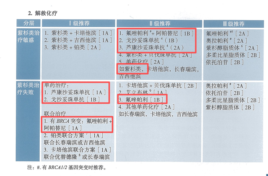 在解救化疗部分,2026版《CSCO BC指南》延续了2025版的风格,继续按“紫杉类治疗敏感”和“紫杉类治疗失败”进行分层。在紫杉类治疗敏感的分层中,2026版指南将紫杉类单药化疗由原来的Ⅰ级推荐调整为Ⅱ级推荐(2A类证据)。在紫杉类治疗敏感和失败分层的Ⅱ级推荐中,氟唑帕利+阿帕替尼与氟唑帕利单药的推荐顺序进行了调整。对于紫杉类治疗敏感的患者,2025版指南将氟唑帕利+阿帕替尼放在Ⅱ级推荐的最后位置(2A类证据),而2026版指南将其调整至Ⅱ级推荐的优先推荐位置(1B类证据)。当然,这一调整针对的是特定人群:对于BRCA1/2基因突变的人群,氟唑帕利+阿帕替尼方案是优先推荐的。