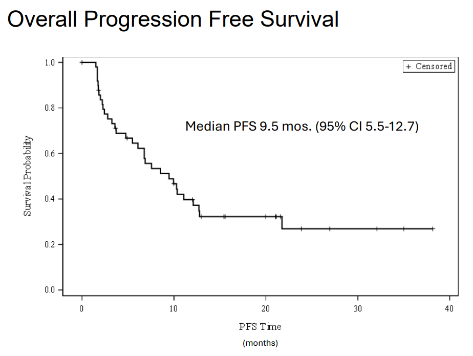 ☆数据显示,在51例可评估患者中,主要终点6个月无进展生存(PFS)率为56.9%。总体人群的中位PFS为9.5个月(95%CI:5.5-12.7)。