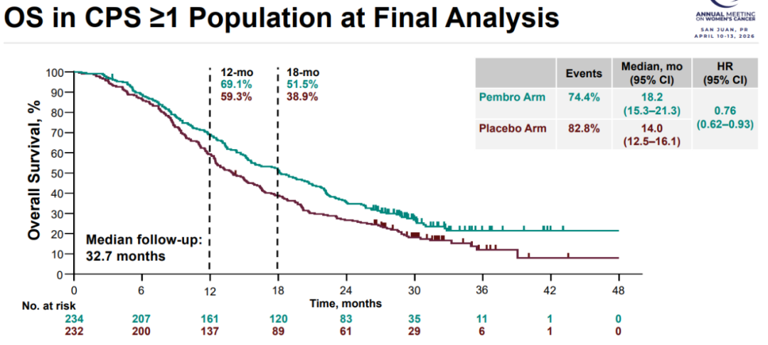 这是首个报道基于免疫检查点抑制剂的方案在卵巢癌CPS≥1人群和ITT人群中总生存期获得统计学显著改善的III期研究。在标准化疗(加或不加贝伐珠单抗)的基础上联合帕博利珠单抗,改善了铂耐药卵巢癌患者的生存结局,并扩展了治疗选择。