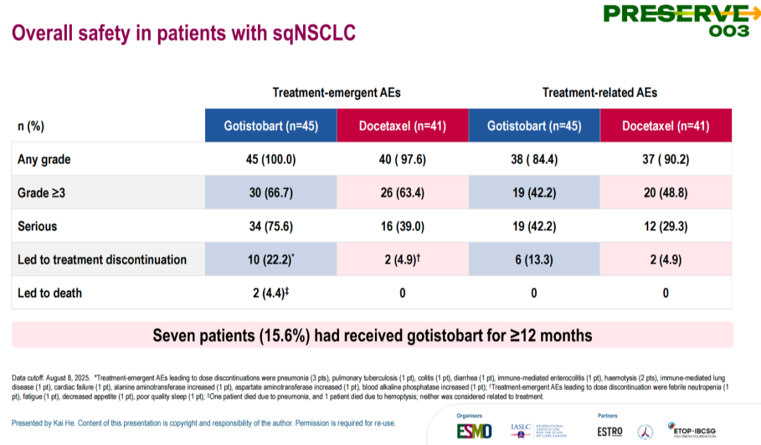 安全性方面,gotistobart组治疗相关≥3级不良事件发生率为42.2%,与多西他赛组的48.8%相当;但任何级别严重不良事件发生率较高(75.6%vs.39.0%),主要与输注相关反应及肝脏实验室异常有关,未观察到预期外的毒性信号。值得注意的是,有7例患者(15.6%)接受gotistobart治疗已达12个月以上。
