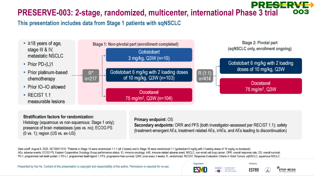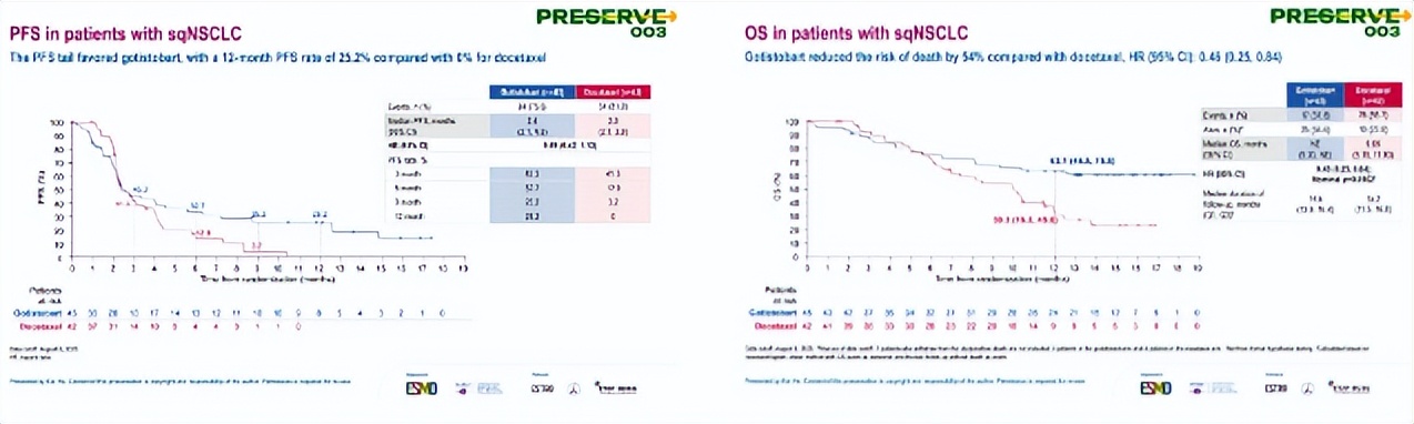与LATIFY研究的阴性结果形成鲜明对比,PRESERVE-003研究(摘要号:3O)评估了一种新型pH敏感性抗CTLA-4单抗gotistobart(BNT316/ONC-392)对比多西他赛,用于既往接受过抗PD-(L)1和含铂化疗后进展的转移性鳞状非小细胞肺癌患者的疗效。该研究为III期试验的第1部分,gotistobart组纳入45例患者和多西他赛组纳入42例患者。