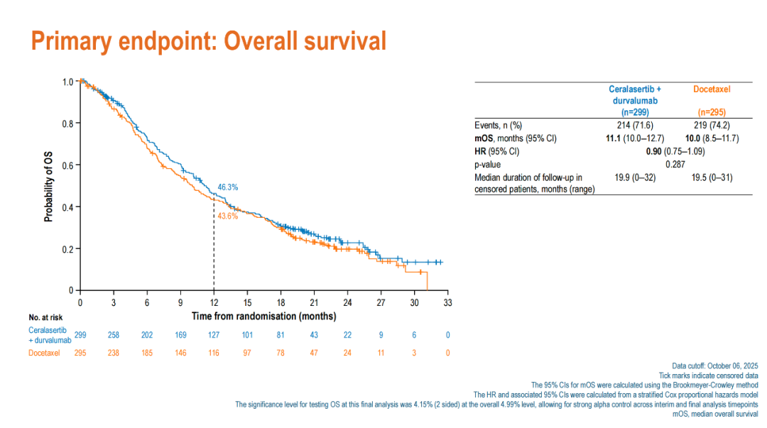结果显示,联合治疗组中位OS为11.1个月,多西他赛组为10.0个月(HR=0.90,95%CI 0.75–1.09,p=0.287),未达到统计学显著性。