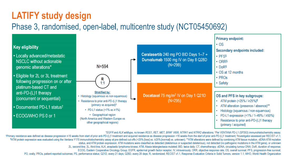 在免疫检查点抑制剂已重塑肺癌治疗格局的背景下,获得性免疫耐药仍是临床面临的重要挑战。迄今为止,尚无药物在头对头OS比较中击败多西他赛。本次大会公布的LATIFY研究(摘要号:LBA1)旨在验证ATR抑制剂ceralasertib联合度伐利尤单抗对比多西他赛,在既往接受过抗PD-(L)1和含铂化疗后进展的局部晚期或转移性非小细胞肺癌(NSCLC)患者中的疗效。该III期研究随机入组299例联合治疗组和295例多西他赛组,主要终点为OS。
