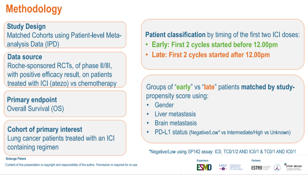 昼夜节律与抗肿瘤免疫之间的生物学联系曾为“时间免疫疗法”提供了理论依据。既往回顾性研究提示,将免疫检查点抑制剂安排在一天中的较早时段(如中午前)给药可能增强疗效。然而,本次大会公布的ETOP-Roche i-TIMES研究(摘要号:LBA2)对此提出了重要修正。该研究是一项基于8项随机对照试验(IMpower110、130、131、132、133、150、OAK、POPLAR)的患者水平Meta分析,共纳入3,501例接受阿替利珠单抗治疗的肺癌患者。通过倾向评分匹配,最终获得775例较早给药组(前两个治疗周期起始时间在中午12:00之前)与775例较晚给药组(中午12:00之后)。