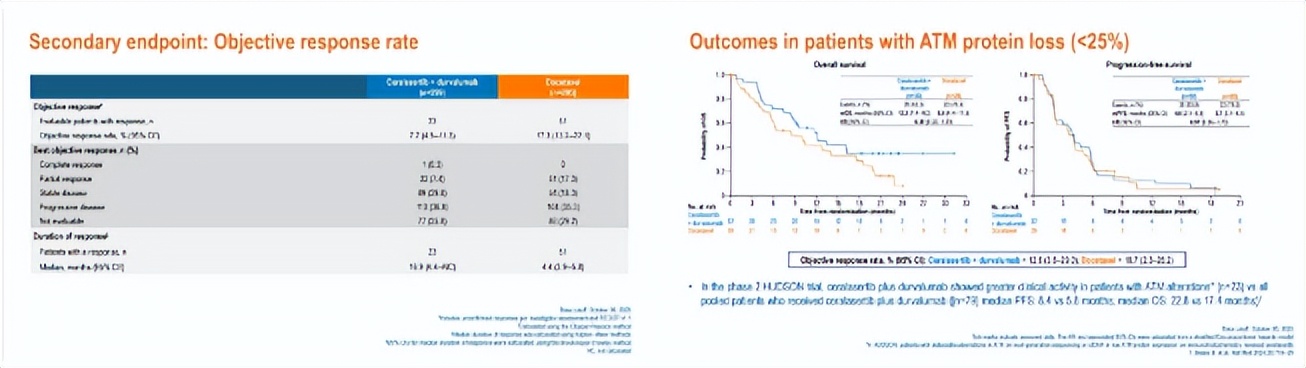 客观缓解率(ORR)联合治疗组仅为7.7%,显著低于多西他赛组的17.3%。在预设的ATM蛋白缺失亚组(表达<25%)中,联合治疗组ORR为12.5%,多西他赛组为10.7%,未重复此前II期HUDSON研究中观察到的临床活性信号(HUDSON研究中ATM改变患者中位PFS为8.4个月,中位OS为22.8个月)。