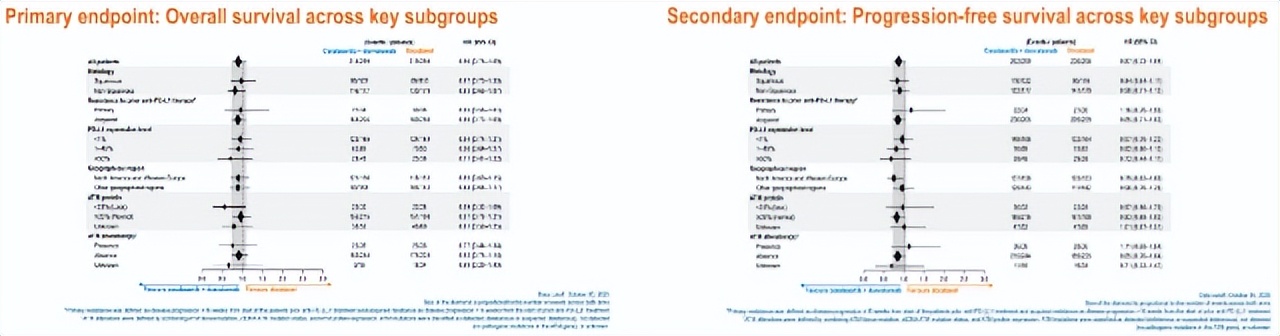 结果显示,较晚组中位总生存期(OS)为16.0个月,较早组为17.3个月(HR=1.039,95%CI 0.925–1.168)。研究预设的非劣效界值为HR上限1.18,实际95%CI上限为1.168,未超过该界值,成功证明了较晚给药相对于较早给药的非劣效性(非劣效检验p<0.025)。在多项敏感性分析中,无论是否联合化疗、PD-L1表达水平如何,结果均保持一致。