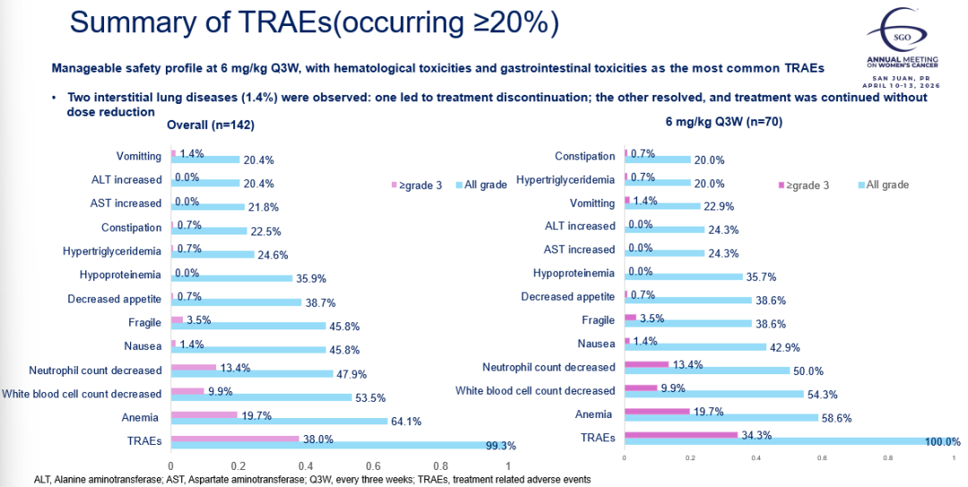 在142例安全性可评估患者中,≥3级治疗相关不良事件(TRAE)发生率为38.0%,严重不良事件为26.8%,停药率仅1.4%,剂量降低率为7.7%,体现了良好的耐受性。最常见的毒性为可控的血液学毒性和胃肠道毒性(贫血、白细胞减少、恶心等),与拓扑异构酶I抑制剂类ADC的典型特征一致。更重要的是,SYS6043在安全性上展现出多项差异化优势: