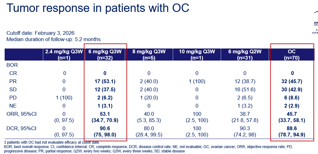 在70例可评估疗效的卵巢癌患者中,SYS6043的客观缓解率(ORR)为45.7%,疾病控制率(DCR)高达88.6%,中位无进展生存期(PFS)达到8.3个月,中位缓解持续时间(DoR)为6.9个月。在高级别浆液性卵巢癌中观察到更高的活性(ORR:51.8%)。在6 mg/kg、每3周一次(Q3W)给药的患者(n=32)中,ORR为53.1%,DCR为90.6%。