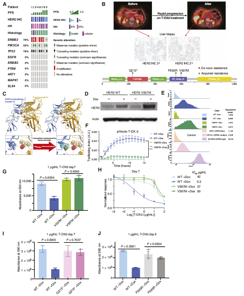 研究团队在接受新型抗HER2 ADC药物治疗的临床队列中,发现了三种位于曲妥珠单抗结合界面的ERBB2突变(V597M、p.Q213*、P593R),这些突变显著影响了药物的结合与内化。