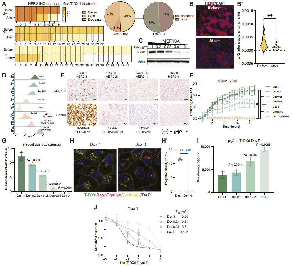 在比较配对的治疗前和进展后样本时,50例(49%)患者的HER2 IHC水平出现主要下降。在这些患者中,26例(52%)出现了HER2表达的完全丧失(降至IHC 0)。在另一个使用靶向TROP2的ADC(戈沙妥珠单抗)治疗的20例对照组中,仅有1例(5%)出现了HER2表达的完全丧失,表明HER2的丢失主要是在靶向药物的选择压力下发生的。对15个治疗前和16个治疗后的患者样本进行的定量免疫荧光(IF)分析进一步证实,新型ADC药物治疗后HER2染色强度显著降低(P<0.01)。
