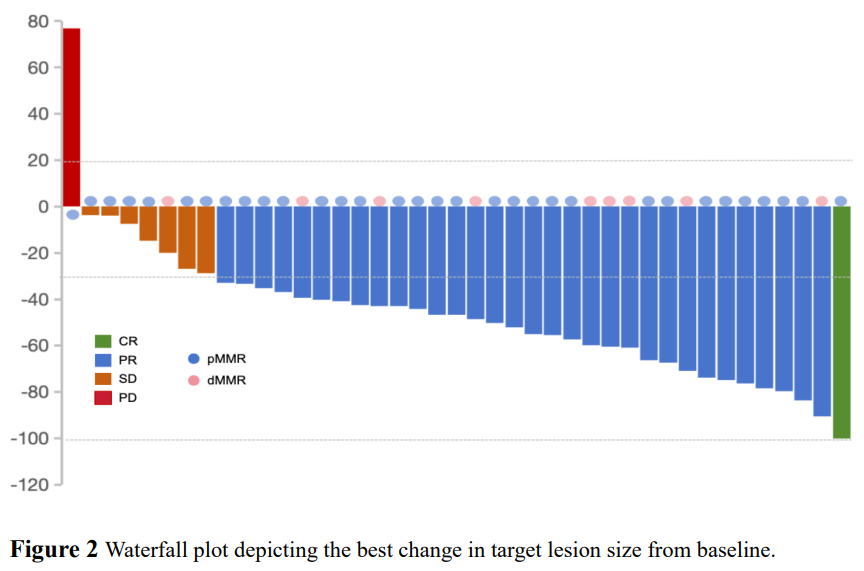 根据MMR状态进行分层:pMMR人群的中位无进展生存期为17.77个月(95%Cl:7.13-NR)。12个月PFS率方面,dMMR人群为85.7%(95%Cl:63.3-100),pMMR人群为51.6%(95%Cl:35.5-75.1)。12个月OS率方面,dMMR人群为85.7%(95%Cl:63.3-100),pMMR人群为89.0%(95%Cl:77.9-100)。无论MMR状态如何,患者均能从该联合方案中获得持久的生存获益。