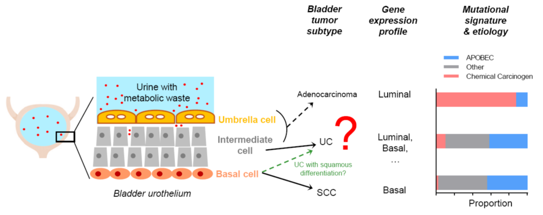 图3.主要研究发现。综合分析基因表达谱和突变特征可探索几类膀胱癌的细胞起源和潜在病因。