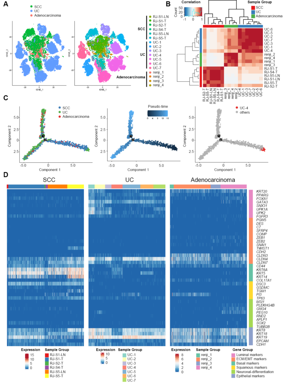 图2.膀胱鳞癌及其他相关类型的单细胞表达谱特征。(A)tSNE图显示膀胱鳞癌、膀胱腺癌、尿路上皮癌的肿瘤单细胞分布情况。(B)几类膀胱癌的单细胞表达谱相似性分析。(C)几类膀胱癌单细胞的拟时序轨迹变化分析,其中UC-4样本的病理诊断为尿路上皮癌伴鳞样分化。(D)几类膀胱癌的肿瘤单细胞中代表性标志物的表达情况。