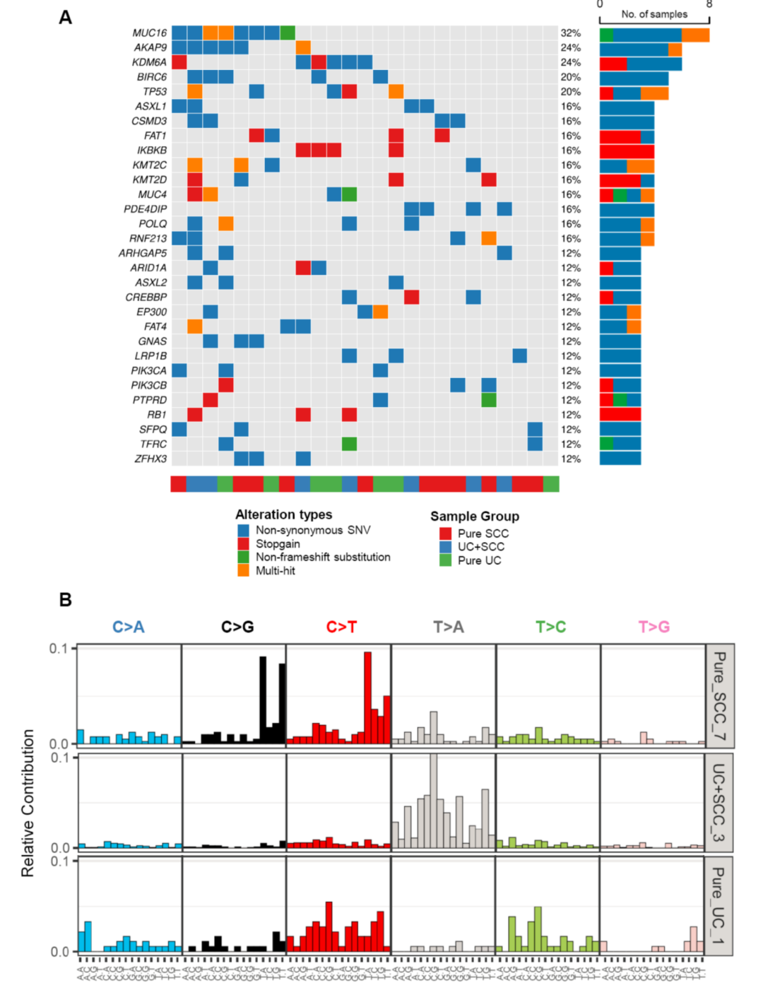 图1.膀胱鳞癌及其他相关类型的突变特征。(A)几类膀胱癌中的高频突变基因。(B)膀胱癌中的几种代表性突变指纹。