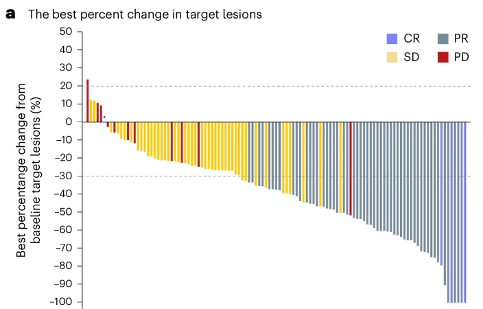 该研究的更新随访结果(随访截至2024年9月28日)显示*,戈来雷塞治疗117例患者的ORR达49.6%,30.8%患者实现深度缓解(肿瘤缩小幅度>50%),难能可贵的是,其中有6%的病人在首次评估中即达到CR,且在各预设亚组中保持一致ORR,疾病控制率(DCR)达86.3%,中位缓解持续时间(DoR)达14.5个月;全部患者中位PFS达8.2个月,中位OS为17.5个月,相比首次评估数据(13.6个月)延长了4个月。戈来雷塞在安全性方面同样表现良好,≥3级治疗相关不良事件(TRAE)发生率为38.7%,仅6例患者因TRAEs停药,常见TRAEs包括贫血、血胆红素升高和肝酶(ALT/AST)升高等,而胃肠道不良反应发生率较低且大多程度轻微。
