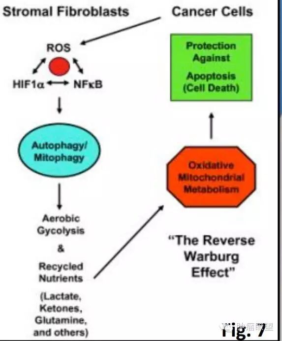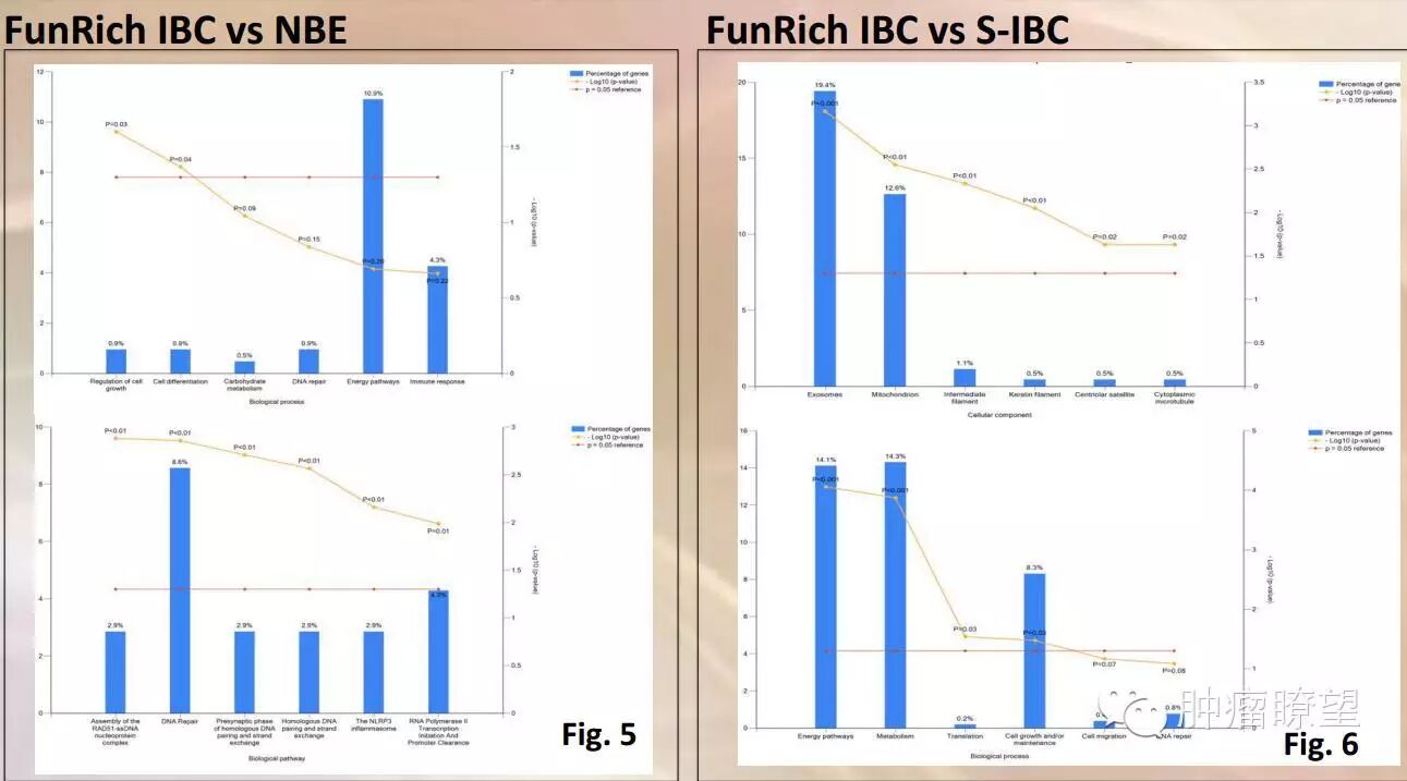 RNA-seq揭示了一系列乳腺癌进展过程中上皮细胞和相邻间质的基因表达的改变。①S-IBC vs.S-NBC ,我们发现有意义基因参与了免疫系统细胞凋亡和细胞因子信号传导(Figure 4) ;②IBC vs. NBE,我们发现这些基因主要参与了DNA修复和能量通路(Figure 5);③为调查其在上皮细胞和间质之间发挥的作用,IBC vs S-IBC发现,这些基因参与新陈代谢和能量通路,细胞组成为外泌体和线粒体(Figure 6)。数据与反向沃伯格效应非常一致(Figure 7)。研究者认为需要对正常乳房上皮细胞发展为微小浸润性乳腺癌的分子事件做深入分析,尤其需要更好地理解间质和上皮之间分子交流机制。对微小浸润性乳腺癌上皮细胞和间质的分子改变研究可导致新疗法的出现。