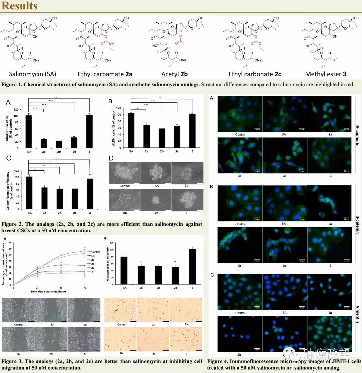 采用盐霉素和四种类似物对JIMT-1 细胞进行72小时处理。研究结果显示,盐霉素类似物(图2a、图2b、图2c)的浓度为50 nmol/L,对癌症干细胞有选择性活性。盐霉素和选定的类似物通过诱导间充质细胞向上皮细胞转换而抑制细胞迁移和侵袭。