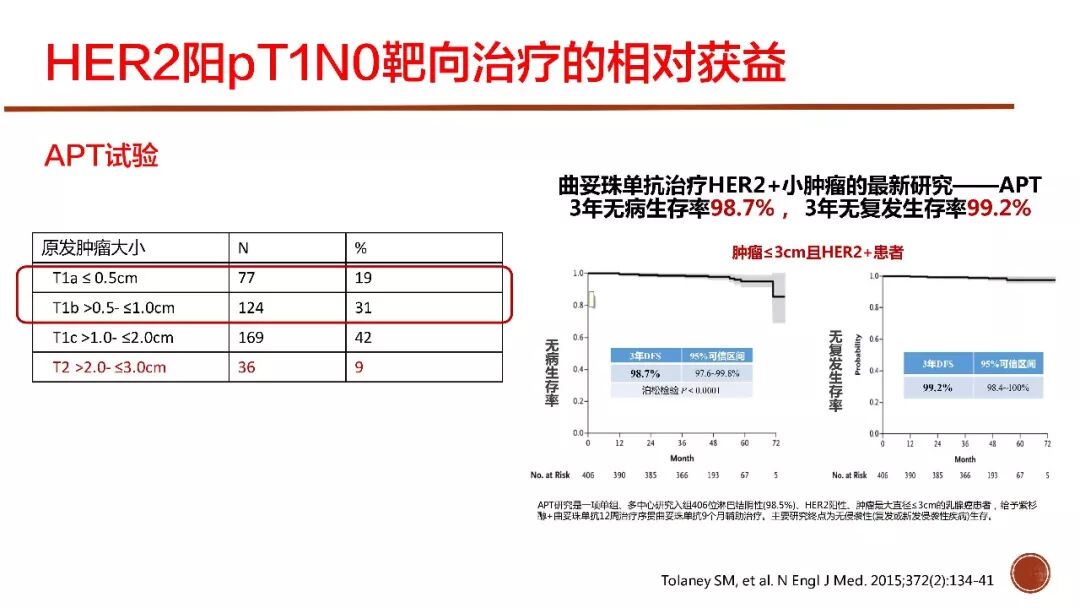 以MSKCC等为代表的回顾性分析显示,HER2阳性T1小肿瘤可以从辅助靶向治疗中获益。APT是迄今唯一针对HER2阳性早期小肿瘤前瞻性临床试验。该试验通过非随机单臂设计,旨在为HER2阳性而高危因素较小的患者提供简化的化疗靶向方案。结果显示,这部分患者确实得到了良好的生存结果,3年的DFS率达到98.7%,RFS率为99.2%。细看APT试验中原发肿瘤大小的入组情况,T≤0.5cm入组77名患者,占19%。