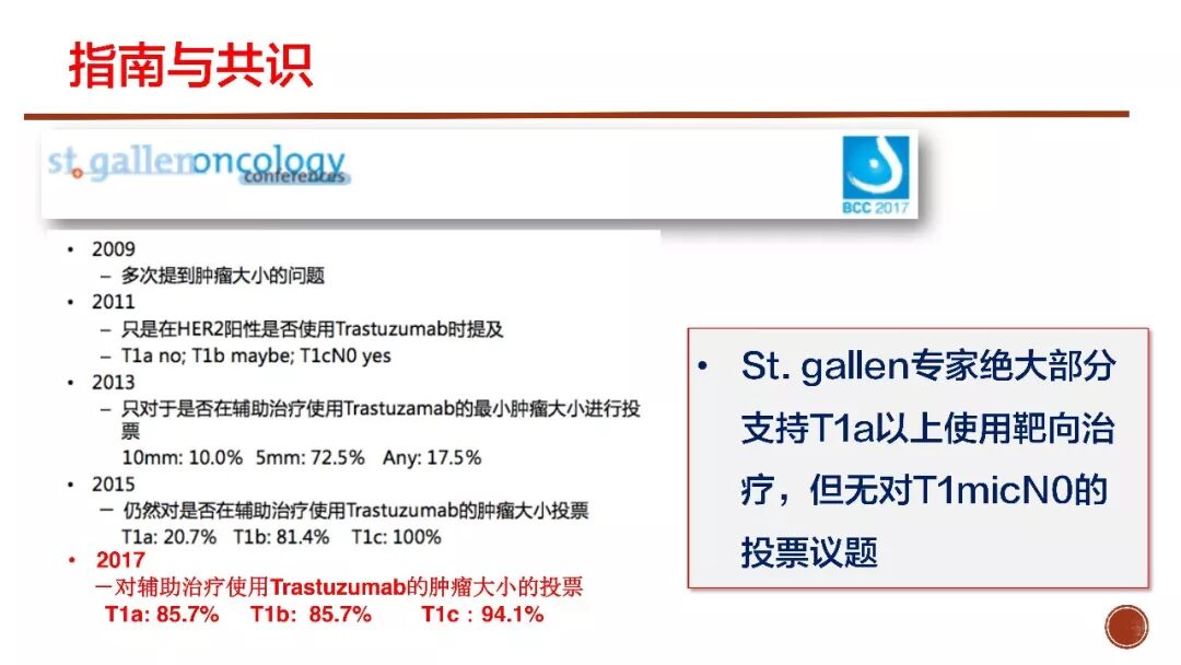 2018ESMO早期乳腺癌国际共识指出:曲妥珠单抗被认可用于淋巴结阳性和N0且T>1cm患者。考虑其相对高复发风险,对于T<1cm N0患者,曲妥珠单抗也可考虑应用,特别是ER阴性患者,证据等级为IV级,推荐等级为B类。St gallen专家共识从2009年开始多次提到HER2阳性早期辅助靶向治疗人群的肿瘤大小问题。2011年的共识对于T1a者无一人支持使用曲妥珠单抗,到2017年已有85.7%的专家投票支持对T1a者使用曲妥珠单抗靶向治疗。但值得注意的是,目前尚无针对pT1micN0者是否需要辅助靶向治疗的专家议题。