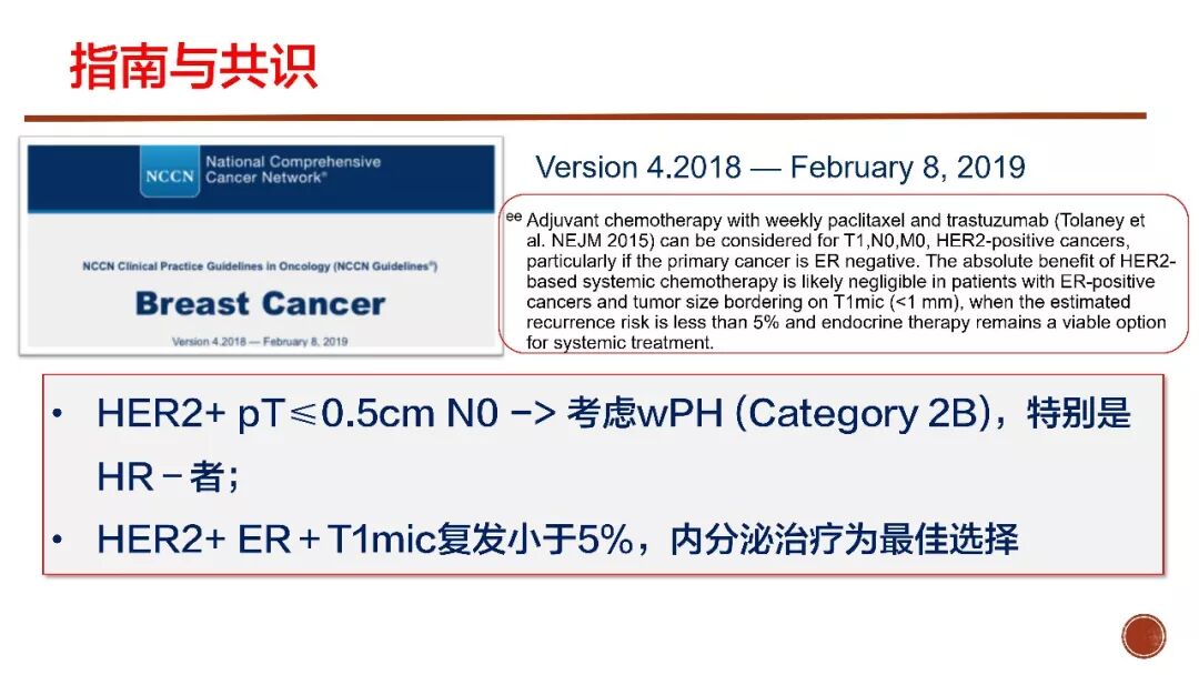 最近更新的Version 4. 2018 NCCN乳腺癌指南中,关于HER2阳性小肿瘤的辅助靶向治疗规范中写道:HER2的pT≤0.5cm N0患者可考虑使用周疗紫杉加曲妥珠单抗,特别是ER阴性者,证据等级为2B类。文中特别提到,对于HER2阳性ER阳性的T1mic者复发风险小于5%,内分泌治疗为最佳选择。