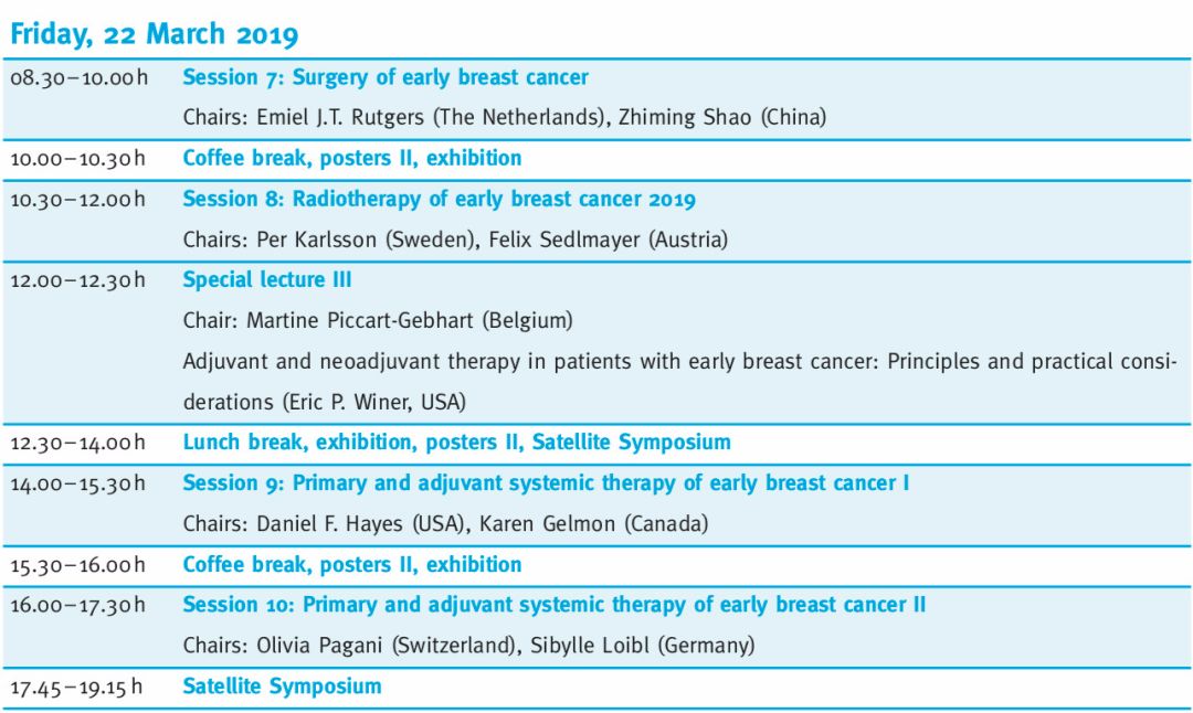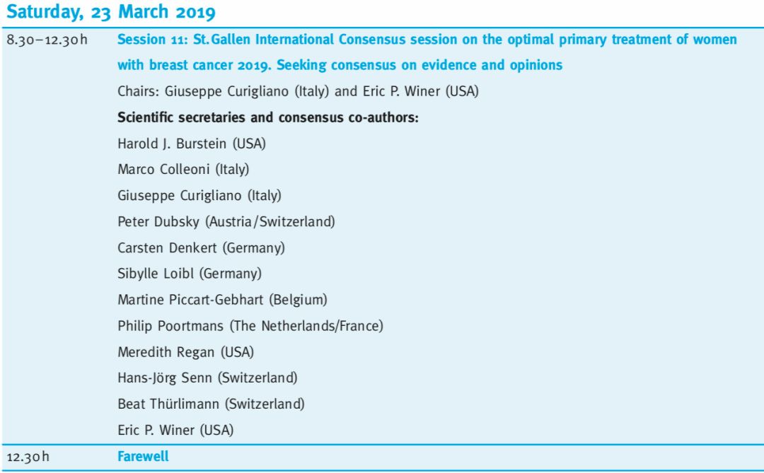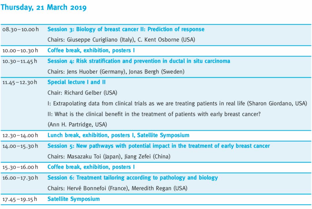 最受瞩目的2019年St.Gallen乳腺癌优化一线治疗共识(optimal primary treatment)投票将在这次会议中进行,来自世界各地的乳腺癌专家,分享最新的研究成果,并根据近两年最新的研究数据进行综合讨论和分析,形成最新的乳腺癌诊疗专家共识。