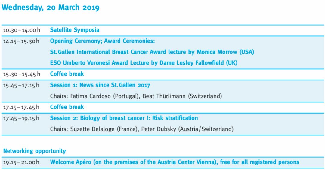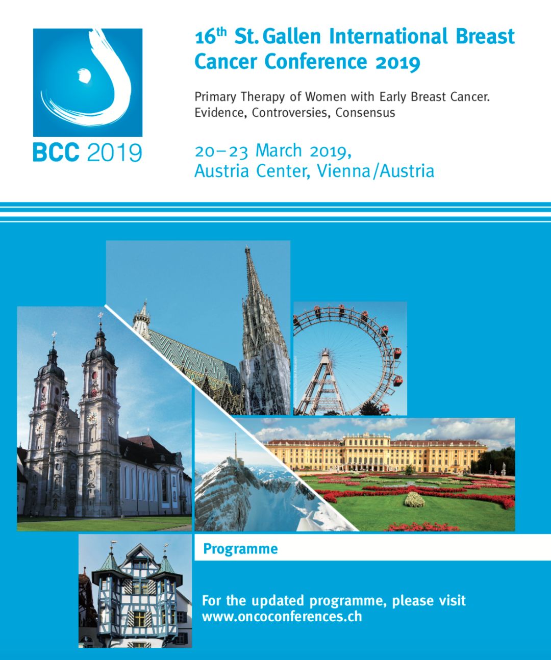 2019年第16届圣加仑国际乳腺癌年会(St BCC 2019)将于当地时间3月20-22日在奥地利维也纳召开。圣加仑国际乳腺癌会议是自2007年以来开始每两年举办的一次大会。近年来,随着国人生活方式西化、精神压力日益加重、生活节奏越来越快,乳腺癌一跃而位居女性肿瘤的前一,国际乳腺癌会议为各位专家提供一个沟通交流的平台,互相学习了解,在这里他们将会呈现他们最新的数据和该领域知名专家的批判性评论。在为期3天的日程里,会议将安排涵盖整个乳腺癌领域的多场学术交流活动,内容形式丰富。
