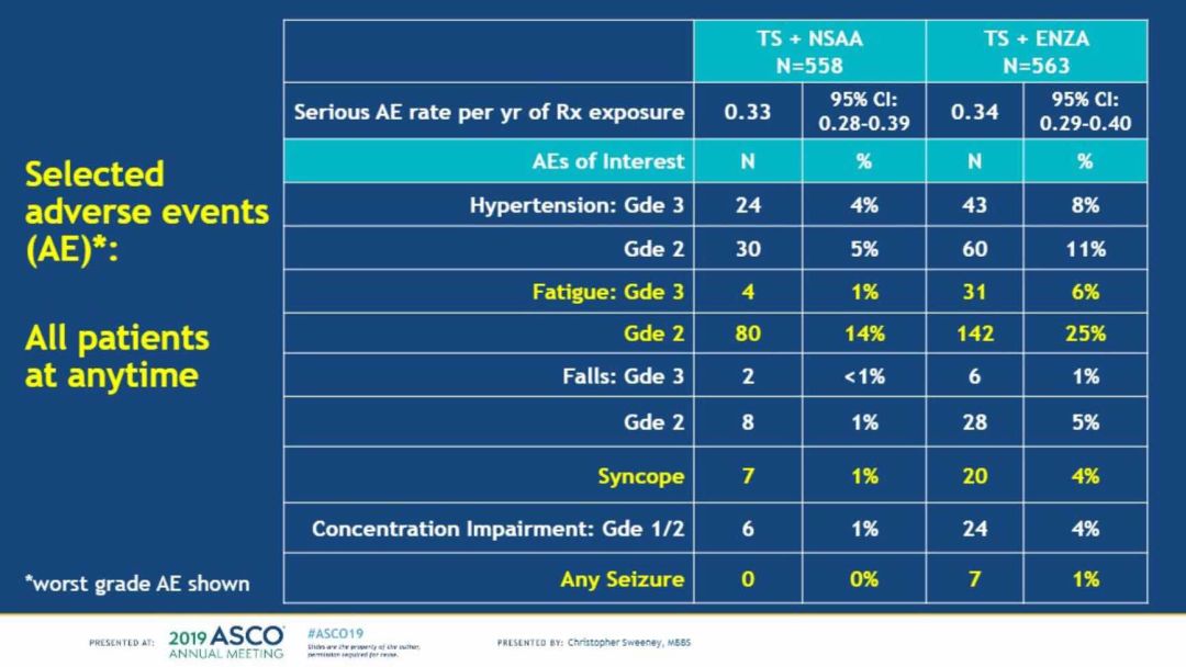 在研究治疗后30天内,42%的ENZA组患者与34%的NSAA发生严重不良事件(不论归因),与研究治疗的不同持续时间相当。