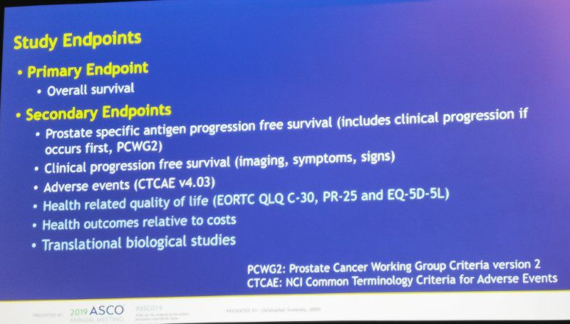 主要终点是总生存(OS)。次要终点包括PSA无进展生存(包括临床进展,PCWG2)、临床无进展生存(影像、症状、体征等)、不良事件(CTCAE v4.03)、健康相关生活质量(EORTC QLQ C-30,PR-25和EQ-5D-5L),生物学转化研究和健康相关成本等。
