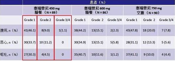 图8. ASCEND-8研究结果:不同剂量塞瑞替尼不良反应比较