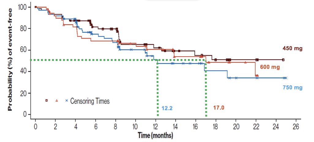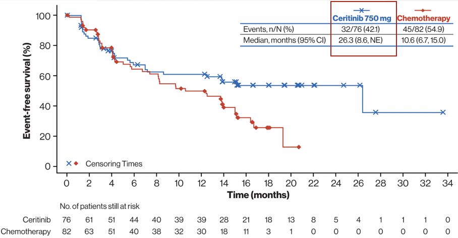 ASCEND-4研究全部376例患者中,158例为亚裔,占比42.0%。其中塞瑞替尼组76人,化疗组82人,中位随访时间为18.3个月(13.5–34.2),最新发布的亚洲人群的结果显示,中位PFS达到了26.3个月。