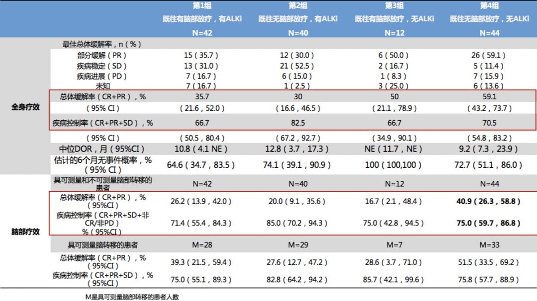 PFS和OS:中位PFS在既往接受过ALK-TKI治疗的两组患者中约为5-7个月,既往未接受过ALK-TKI治疗的患者中位PFS为 7.9个月。整体患者的OS目前仍在观察中。