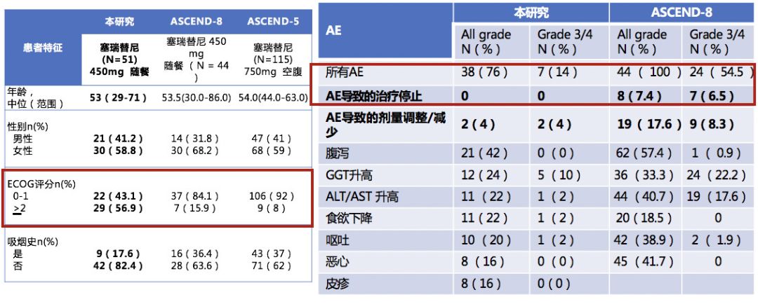 ASCEND-8研究显示,塞瑞替尼(450mg/d)与其他ALK抑制剂相较,AE发生率可控。由于450mg剂量减少了胃肠道局部刺激,患者恶心呕症状下降的非常明显。塞瑞替尼450mg剂量对肝酶(ALT/AST/胆红素)的影响也较其他ALK抑制剂更轻。