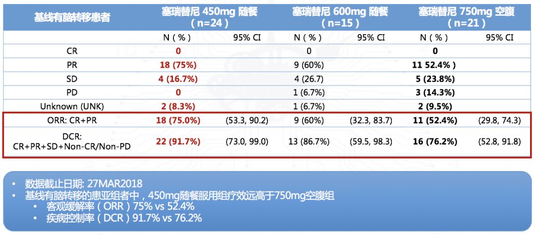 基于ASCEND-8研究结果,塞瑞替尼在中国上市的剂量是450mg随餐口服。在ASCEND-8研究脑转移亚组患者中,塞瑞替尼450mg随餐对于初治脑转移患者的ORR可达到75%,DCR达到90%以上。