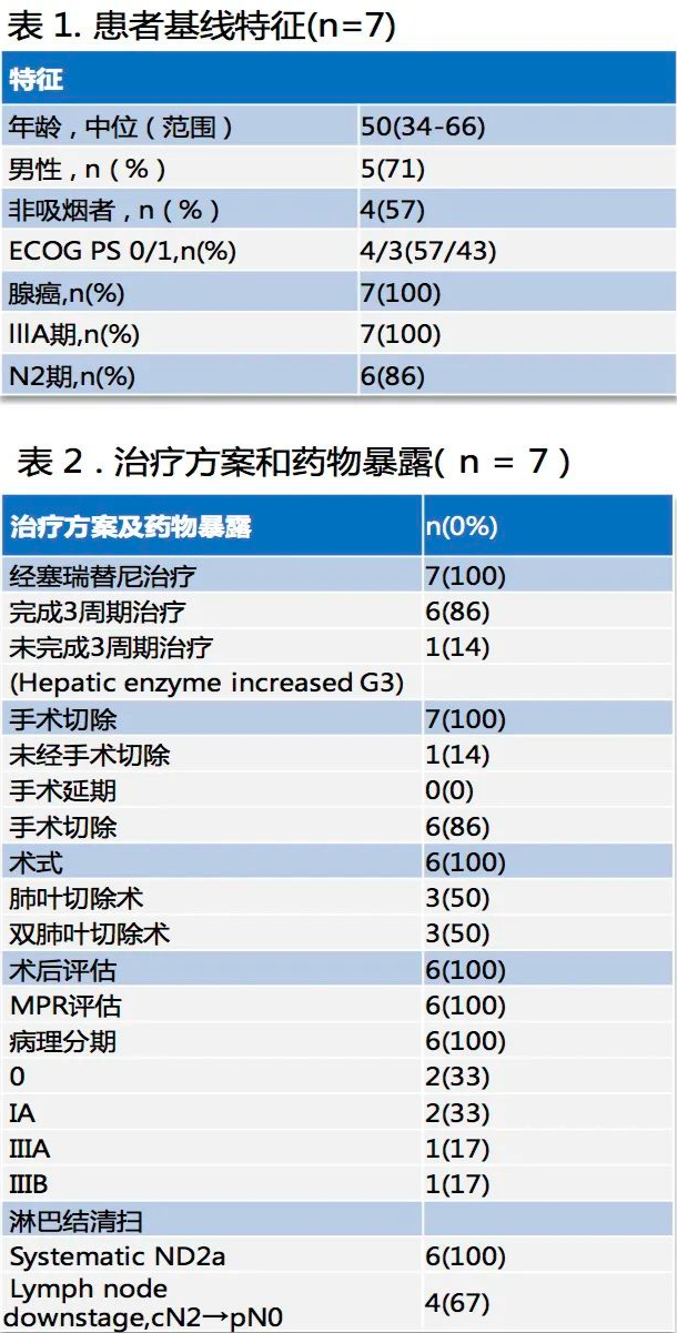 在NSCLC中IIIA期患者比例约不到30%,ALK阳性患者占NSCLC总体3-5%,因此该研究从395名局部晚期NSCLC患者中筛选出15名患者确认为ALK阳性 (4%) ,最终共7名患者入组。诱导治疗应用塞瑞替尼750mg/d,28天为一周期共3个周期,术后持续使用塞瑞替尼辅助治疗1年。结果显示:ORR为100%, 5/6(83%)患者行R0切除,主要病例缓解率(mpRR)为57%(95%CI:18-90),2例(29%)达到病理完全缓解(pCR)。