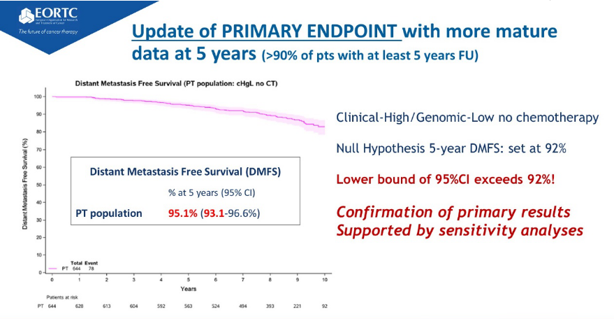 今年ASCO大会更新了MINDACT中位随访8.7年的数据,结果整体上维持了2016年结果。经过长期随访后,C-High/G-Low组中不化疗的患者,更新后的5年DMFS为95.1%,95%可信区间为93.1%到96.6%,区间下界仍然大于92%,故首要终点研究目标依然成立。