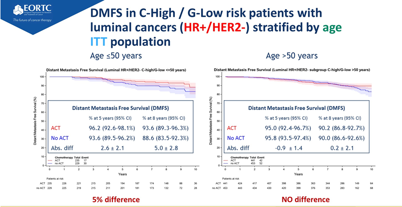 化疗组较非化疗组的获益增大到2.6%,这与一开始报道的1.5%还是提高了一点。鉴于2-3%的DMFS获益对一些医生与患者已经达到值得重视的阈值,确实需要进一步探索哪些C-High/G-Low患者可能带来更明确的化疗获益。探索性研究揭示:如果以50岁为界,50岁以上主要为绝经后的患者,化疗基本没有带来获益(8年DMFS差异0.2%);而50岁以下的非绝经患者,化疗获益可高达5%。虽然以50岁为界的研究是探索性非预设性分析,循证级别较弱,但确实为临床实践带来有益参考。