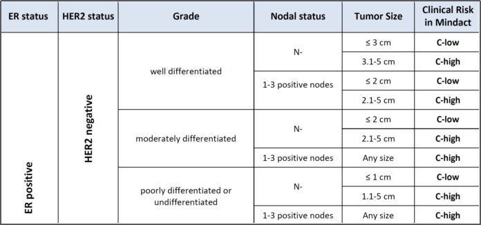 上面我们说70基因工具的应用前提,是我们首先要进行风险判定。如果测评后是临床低危的,就没必要做70基因检测了,直接豁免化疗。那么,采用什么办法去判断风险高低呢?MINDACT方案设计使用的是Adjuvant! Online。这个听起来是高大上的网络大数据分析,但在具体实施过程中,MINDACT试验方案对Adjuvant! Online作了简化,在论文发表的附加文件中我们可以看到评判标准(以下仅以ER阳性HER2阴性人群为例):