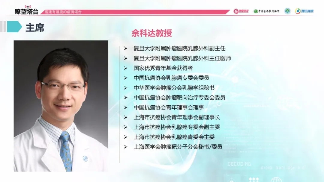 2020年6月7日(周日)10:00-11:10,“瞭望塔台”举行了7位大咖专家参与的乳腺癌诊疗研讨会,主题为“探讨新辅助化疗序贯或联合内分泌的抉择”。复旦大学附属肿瘤医院余科达教授担任会议主席,福建医科大学附属协和医院傅芳萌教授介绍了新辅助化疗联合内分泌的研究现状,7位专家分享了各自的临床应用经验;北京大学肿瘤医院曹威教授介绍了一则病例,专家们针对本病例存在的疑点、难点及诊治中的困惑进行了热烈地讨论和深入地剖析。