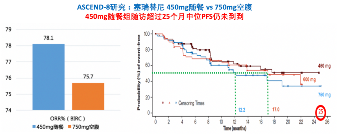 ASCEND-4研究中,塞瑞替尼750mg剂量胃肠道AE高发。在ASCEND-8研究中,探索了不同剂量和给药方式(750mg空腹、450mg随餐和600mg随餐)的药代动力学、疗效和安全性差异。研究结果显示,450mg随餐服用药代动力学参数与750mg空腹相似,同时安全性大为改善,胃肠道AE明显减轻,疗效有所增加。