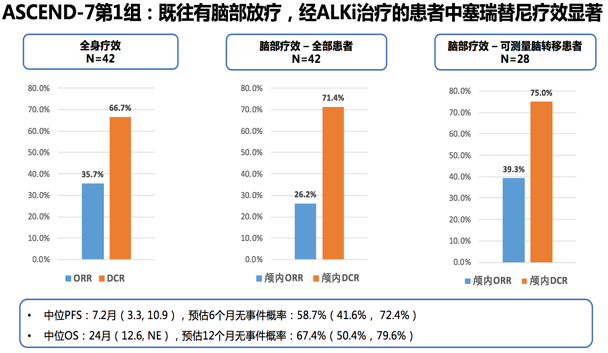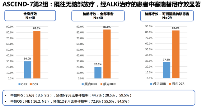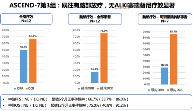 1. 对ALK阳性脑转移疗效卓越,ORR可达30%-60%。对既往未接受过ALK抑制剂的患者(第3、4组),无论是否接受过脑部放疗,总体ORR分别都能达到50.0%和59.1%。4组患者总体DCR均能达到66.7%-82.5%,全部患者颅内DCR可高达71.4%-85%。