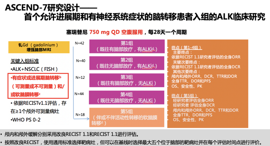 ASCEND-7是首个专门针对ALK阳性有症状、进展期脑转移和脑膜转移的前瞻性临床研究,2019ESMO公布结果后为ALK阳性脑转移的临床治疗带来了极大的信心。