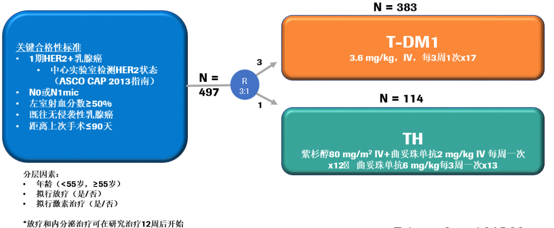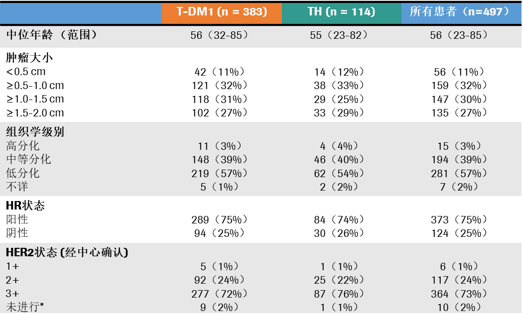 基线特征:研究共入组了512例HER2+患者,497例研究方案治疗,其中T-DM1组和TH组分别为383例和114例。基线特征分析显示,T<0.5cm的患者占11%;T≥0.5-1.0cm的患者占32%;T≥1.0-1.5cm和T≥1.5-2.0cm的患者分别占30%和27%。73%的患者为HR+肿瘤。