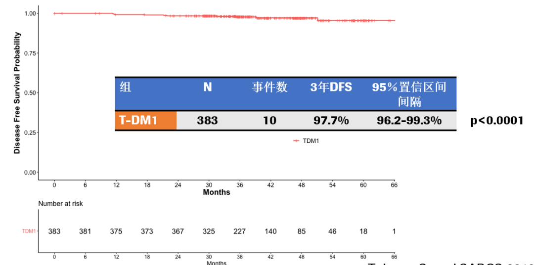 研究发现:中位随访3年后,T-DM1组共出现10个DFS事件,3年DFS率为97.7%(95%CI:96.2%~99.3%)。