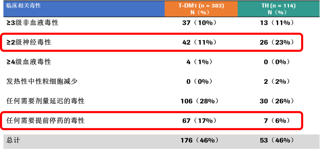 安全性分析:T-DM1组和TH组中,临床有意义的毒性发生率均为46%。两组在≥3度非血液学毒性,≥4度血液学毒性、粒缺性发热、任意需要进行剂量延迟的毒性发生率上相当。T-DM1组≥2度中性粒细胞减少的发生率低于TH组(11% vs 23%);而T-DM1组的任意需要提前终止治疗的毒性发生率高于TH组(17% vs 6%)。
