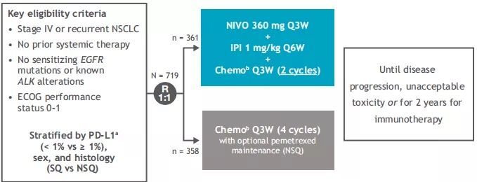 CheckMate-9LA是一项开放标签、多中心、随机III期研究,纳入ECOG PS 0-1且EGFR/ALK突变阴性的IV期/复发性NSCLC患者,旨在评估与单独化疗(4周期)相比,NIVO(360 mg Q3W)+IPI(1 mg/kg Q6W)+2周期化疗的疗效,主要研究终点为OS,次要终点包括PFS、ORR和基于PD-L1分层的疗效。今年ASCO大会上公布的结果显示,Nivo+ipi+2周期化疗可显著改善OS,2020年5月FDA依据该研究批准Nivo+ipi+有限化疗用于晚期EGFR/ALK阴性NSCLC一线患者(无论PD-L1表达)。